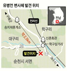 검·경에 따르면 박윤석(77)씨 소유 매실밭에서 발견된 유씨 시체 주변에서는 유씨의 측근이 대표인 ㈜한국제약의 ‘ASA 스쿠알렌’ 빈 병과 천가방 등이 나왔다. 천가방에는 유씨의 자서전 제목인 ‘꿈 같은 사랑’이란 글씨가 적혀 있었다. 매실밭은 검찰이 유씨를 검거하기 위해 지난달 25일 급습했던 송치재 인근 별장에서 걸어서 10분 거리였다. 변사체를 유씨로 의심해 볼 만한 정황들이 충분했다.