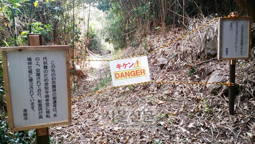 다카시마 공양탑 들어가는 입구에 역사적 사실과 맞지 않는 안내판 2개를 세운 것도 모자라 그 사이를 밧줄 2개로 엮어 ‘위험’이라는 간판을 걸어 ‘길 자체를 폐쇄’했다.