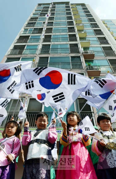 8일 오전 성동구가 광복절까지 태극기 달기 시범 아파트로 운영하는 성동구 홍익동 청계대주파크빌 아파트에서 주민들과 한복을 입은 어린이들이 태극기가 게양된 아파트 앞에서 태극기 포퍼먼스를 하고 있다.
