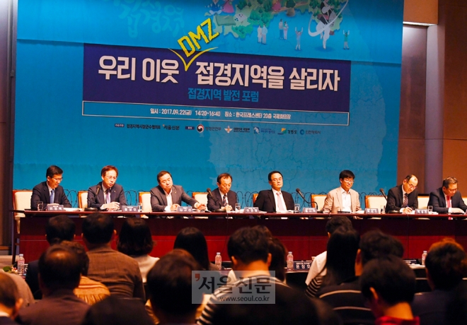 서울신문과 접경지역시장·군수협의회가 함께 마련한 ‘우리 이웃, 접경지역’ 행사의 일환으로 ‘접경지역 발전 정책 포럼’이 22일 한국프레스센터 20층 국제회의장에서 열렸다. 낙후된 접경지역 10개 시·군의 고통받는 주민들의 삶을 재조명해 중앙정부의 정책 지원을 이끌어 내기 위한 취지다.