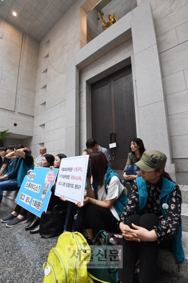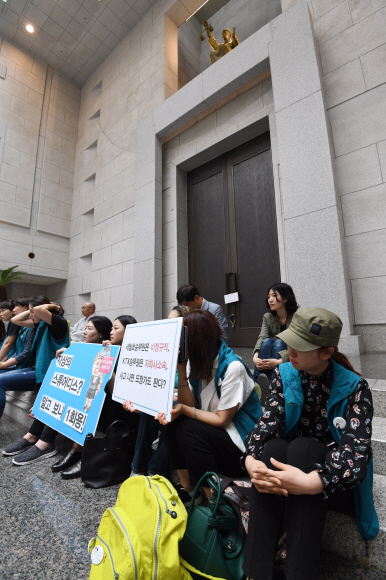 KTX 해고 승무원들이 29일 서울 서초구 대법원 대법정 앞에서 양승태 전 대법원장 구속 수사를 촉구하는 한편 김명수 대법원장의 면담을 요구하며 기습 점거시위를 벌이고 있다.