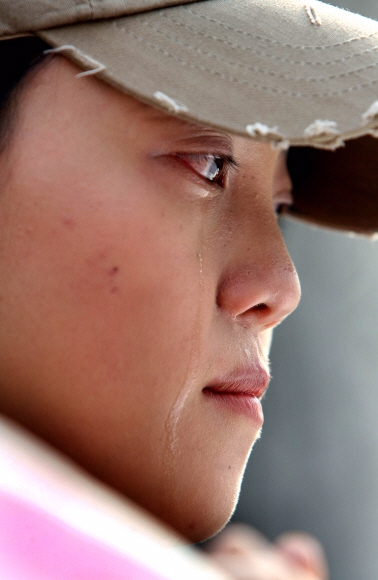 2006년 서울 여의도 국회 앞에서 문화예술인 주최로 열린 비정규직 법안 반대 기자회견에 참석한 한 KTX 승무원이 눈물을 흘리는 모습.