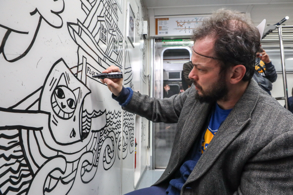 거리 예술가 토마 뷔유가 12일 오후 서울 응암순환 6호선 지하철에서 그의 대표 캐릭터인 ‘무슈샤 웃는 고양이’ 그림을 그리는 행위예술을 하고 있다. 2019. 3. 12.