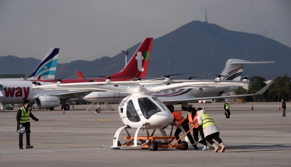 11일 서울 김포비즈니스항공센터(SGBAC)에서 열린 ‘도심항공교통(UAM) 비행 시연 행사’에서 시험 비행을 앞둔 볼로콥터 모습. 도심항공교통은 도심 내 활용이 가능한 친환경 전기동력 수직이착륙기 등을 이용해 승객이나 화물 운송 등을 목적으로 타 교통수단과 연계되어 운용되는 새로운 항공교통체계이다. 2021. 11. 11 공항사진기자단