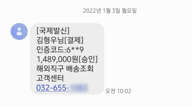 얼마 전 기자에게도 이용한 적 없는 해외직구 결제 문자가 날아왔습니다. 연말연시가 해외직구 시즌인데다가 스미싱 문자가 주로 해외에서 발송되는 만큼 ‘[국제 발신]’ 문구의 의심을 피하기 위해 이같이 위장한 것으로 보입니다. 문자에는 기자의 실명까지 정확히 적혀 있었고, 100만원이 훌쩍 넘는 금액이 결제됐다고 안내됐습니다. 그러면서 고객센터로 통화를 유도했습니다.