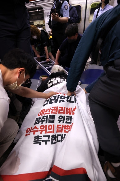사진은 전국장애인차별철폐연대(전장연) 관계자들이 11일 오전 서울 용산구 4호선 삼각지역 승강장에서 ‘오체투지’ 시위를 하고 있다.