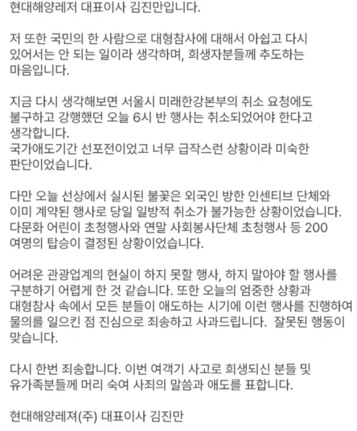 이어 “대형 참사 속에서 모든 분들이 애도하는 시기에 이런 행사를 진행해 물의를 일으킨 점 진심으로 죄송하고 사과드린다”며 “여객기 사고로 희생되신 분들 및 유가족분들게 머리 숙여 사죄의 말씀과 애도를 표한다”고 전했다.