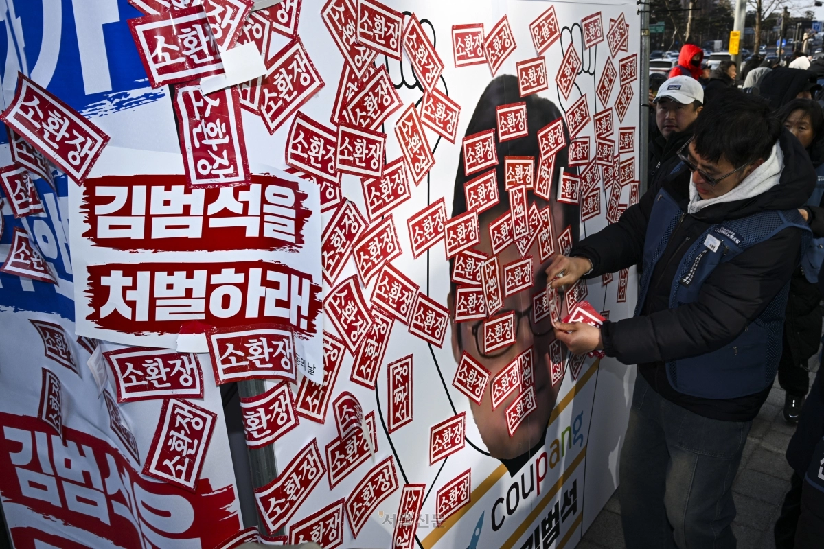 택배노조, 과로사대책위, 산재 노동자 유족 등이 1일 서울 송파구 쿠팡 본사 앞에서 열린 쿠팡 피해자 행동의 날 집회에서 김범석 쿠팡 의장의 처벌과 쿠팡 측의 사과를 촉구하며 소환장 붙이기 퍼포먼스를 하고 있다. 2026.2.1 이지훈 기자