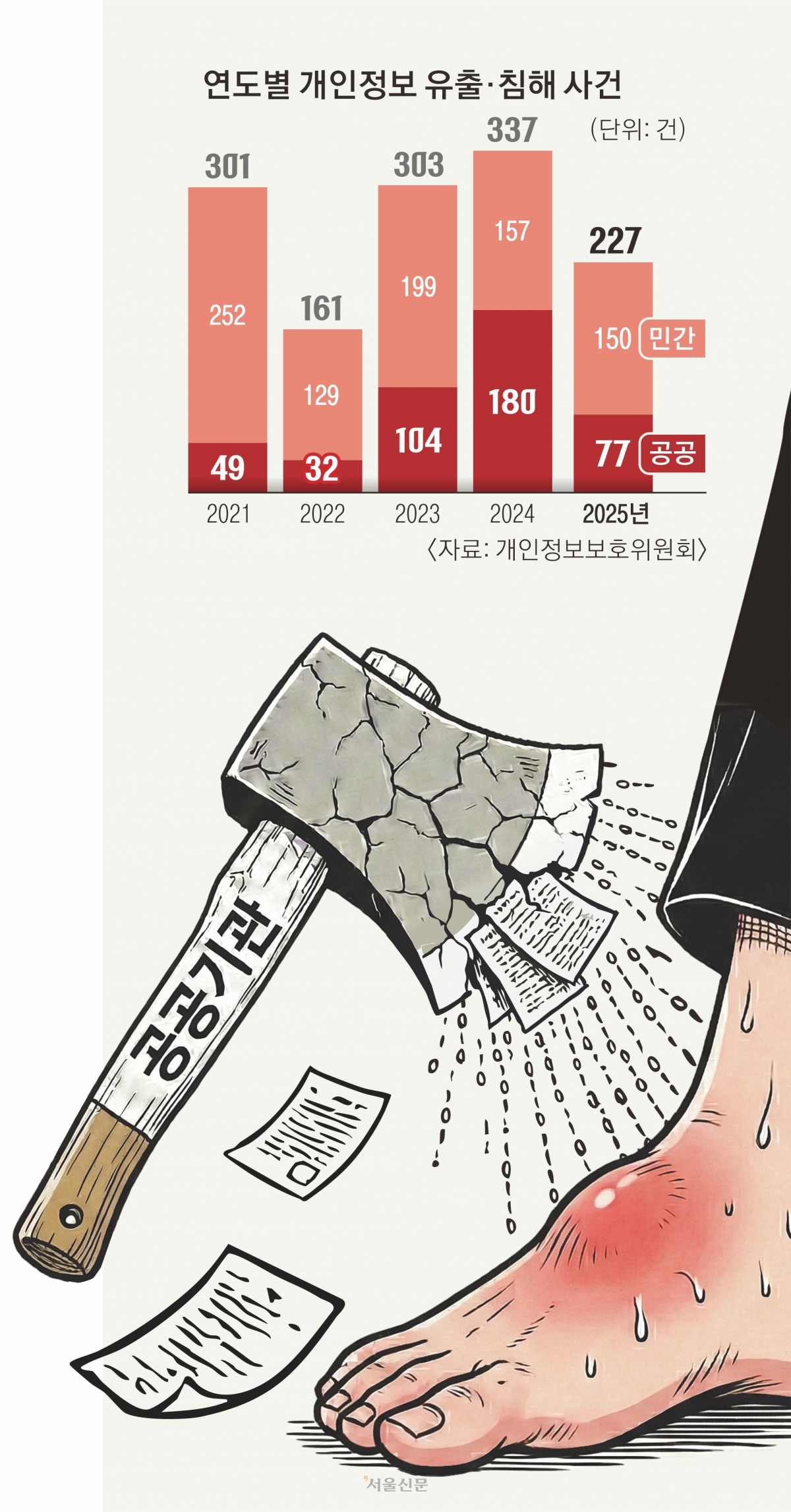 개인정보보호위원회는 최근 5년(2021~2025년)간 민간과 공공영역에서 총 1329건의 개인정보 유출·침해 사건이 발생했다고 2일 밝혔다. 기업 등 민간 영역 유출은 887건(66.7%), 공공영역 유출은 442건(33.3%)이었다. 특히 공공영역 유출은 2021년 49건, 2022년 32건, 2023년 104건, 2024년 180건을 기록하며 대체로 증가 추세를 나타냈다.