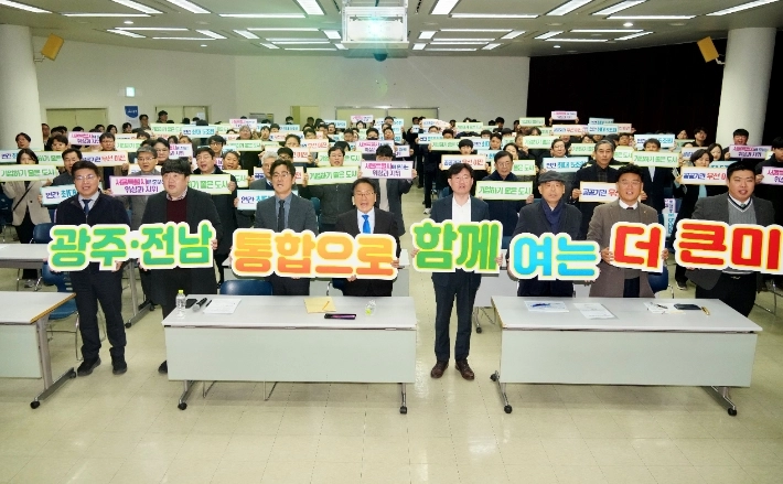 20일 광주테크노파크 본부동 대회의실에서 열린 ‘광주·전남 통합으로 여는 산업비전 설명회’에서 참석자들이 행정통합 응원 퍼포먼스를 펼치고 있다. 광주TP 제공