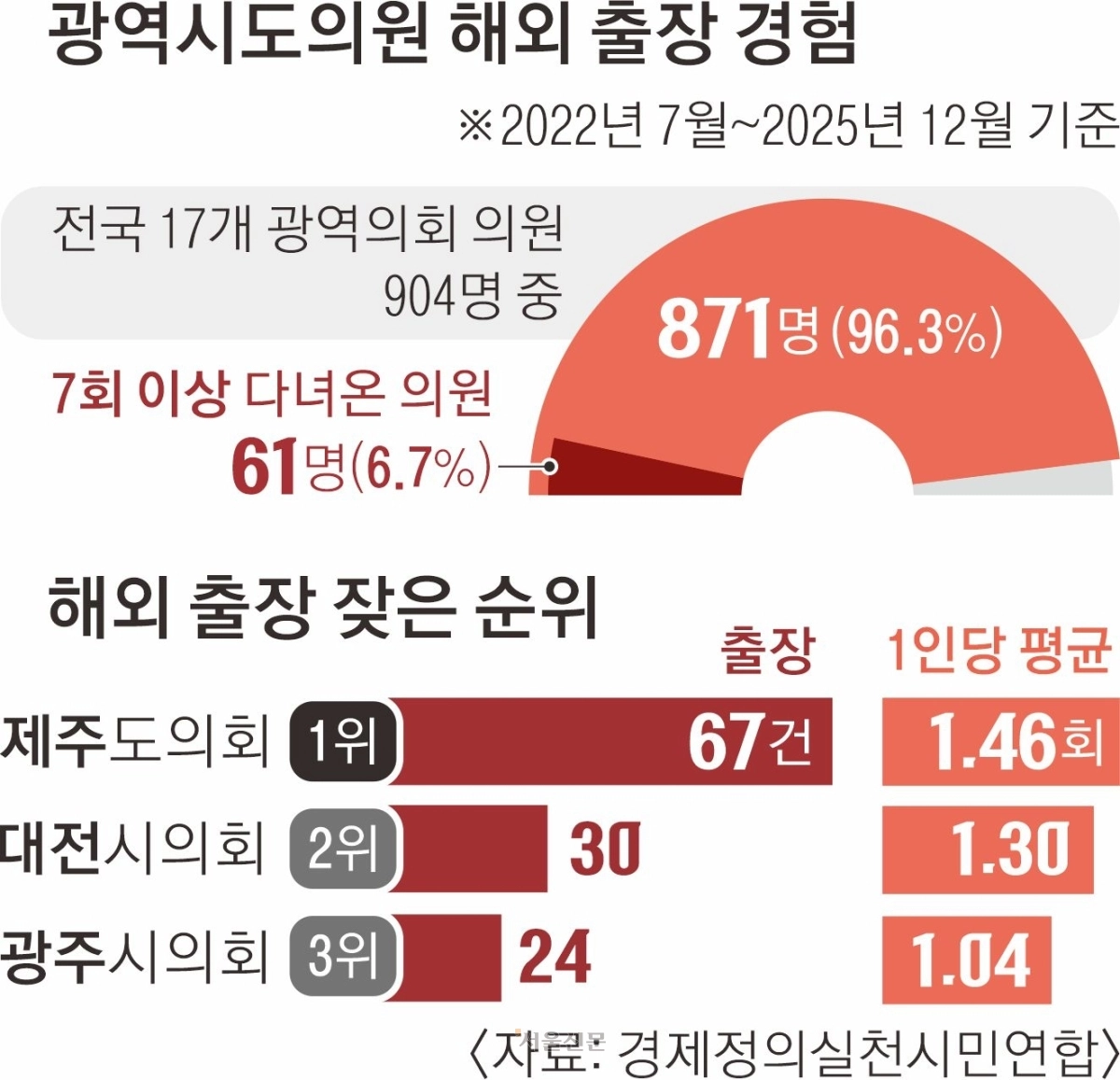 31일 경제정의실천시민연합(경실련)이 2022년 7월부터 2025년 12월까지 전국 17개 광역시도의회 의원들의 해외 출장 자료를 분석한 결과, 전체 904명 중 871명(96.3%)이 해외 출장을 다녀온 것으로 파악됐다. 3년 6개월간 7회 이상 해외 출장을 다녀온 의원도 61명(6.7%)이나 됐다. 해외 출장을 가장 많이 다녀온 사람은 김경학 제주도의원으로 총 16회를 다녀왔으며, 안성민 부산시의원이 14회를 다녀왔다.