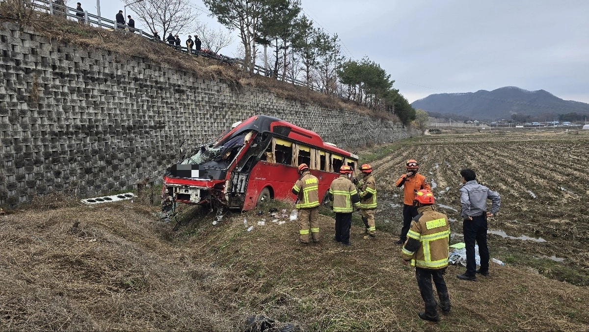 1일 오전 7시 42분쯤 충북 음성군 원남면 상노리의 한 도로에서 승용차와 충돌한 45인승 통근버스가 논으로 추락해 25명이 다쳤다. 충북도 소방본부 제공.