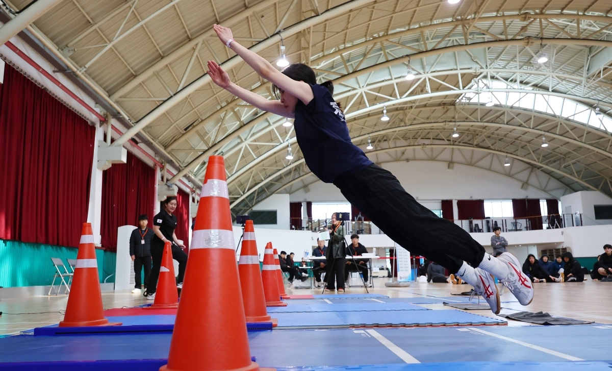1일 인천 서구 인천인재개발원 강당에서 실시된 2026년 소방공무원 신규 채용 체력 시험에서 한 응시생이 제자리멀리뛰기를 하고 있다.