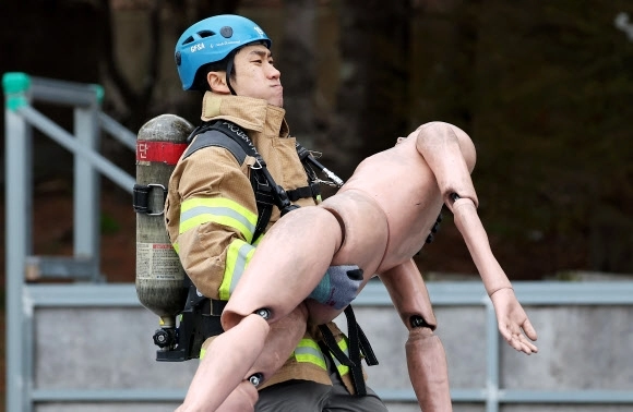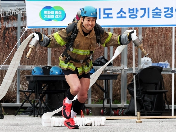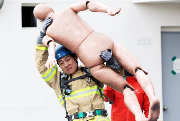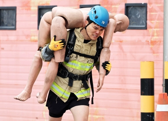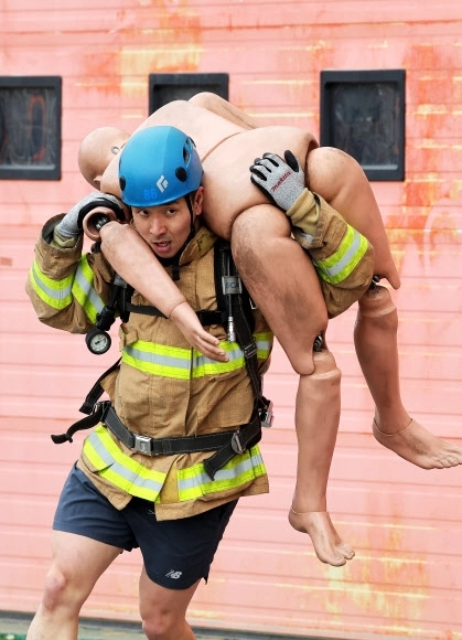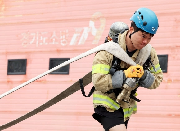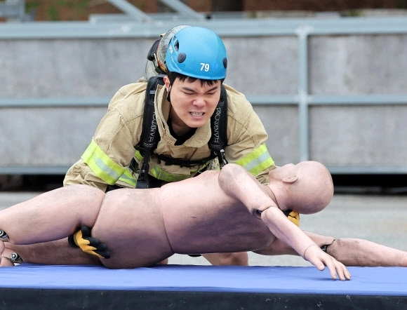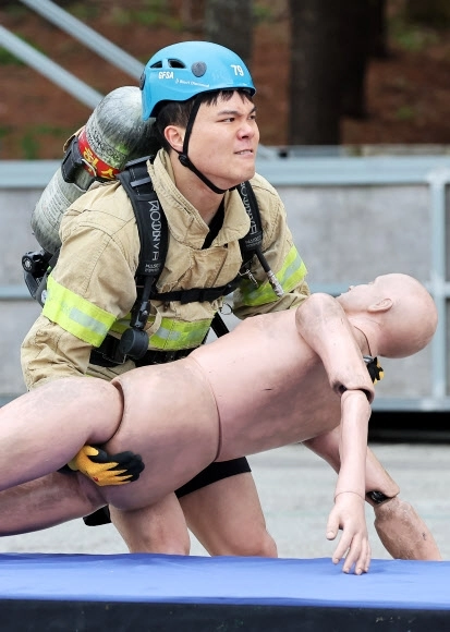 6일 경기도 용인시 경기도소방학교에서 열린 ‘경기도 소방기술 경연대회’에서 최강 소방관 분야 참가자가 기량을 뽐내고 있다.
