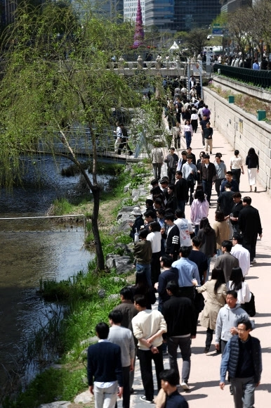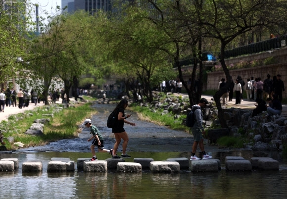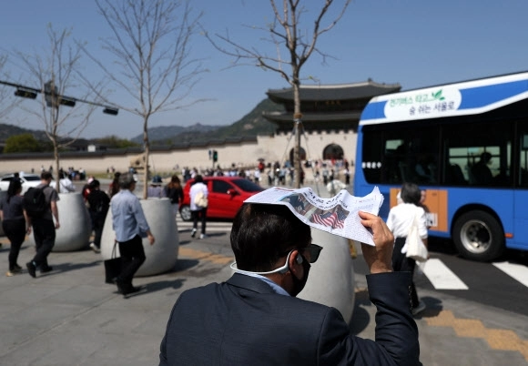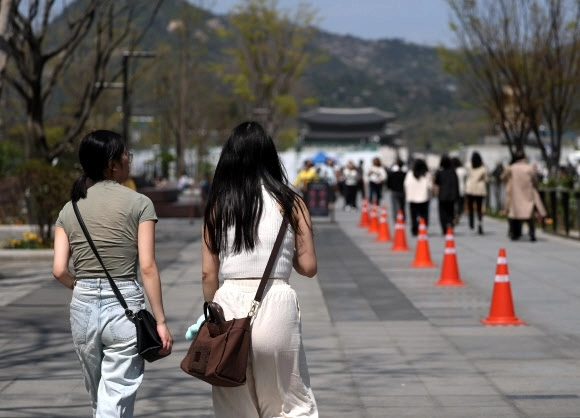 서울의 낮 최고기온이 25도까지 오르는 등 때이른 초여름 날씨를 보인 13일 서울 광화문광장에서 가벼운 옷차림의 외국인들이 이동하고 있다.