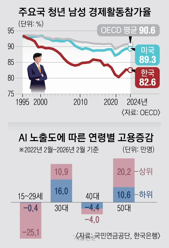 우리나라 남성 청년층의 경제활동참가율이 세계 최고 수준으로 하락하고 있는 것으로 나타났다. AI 확산으로 인한 업무 대체와 여성 경제활동 증가, 기성 세대에 유리한 경직된 고용 구조 등 사회 변화가 복합적으로 맞물린 영향이다.