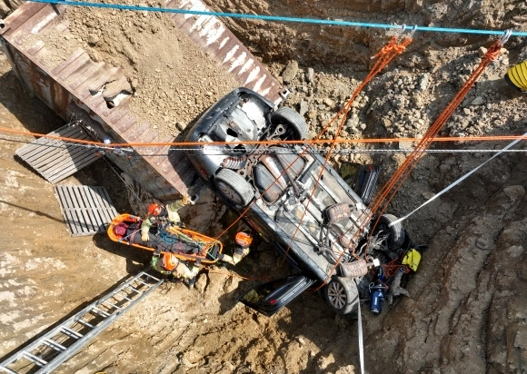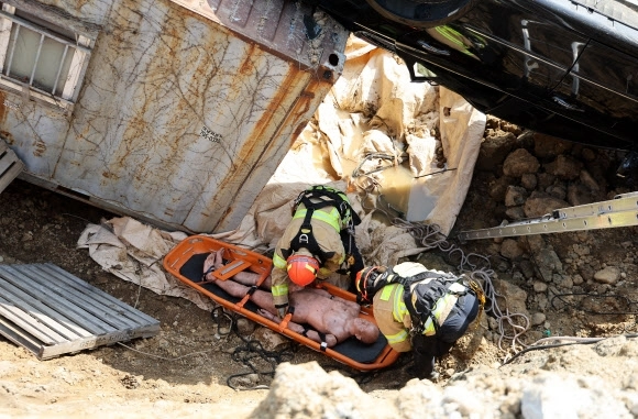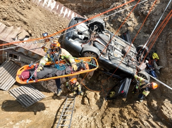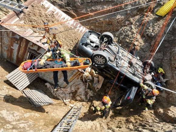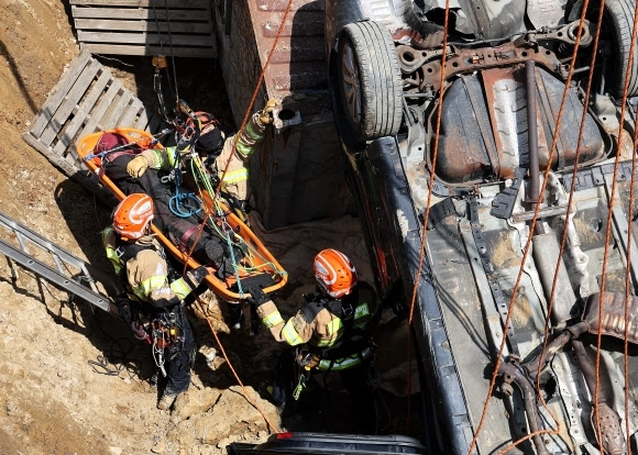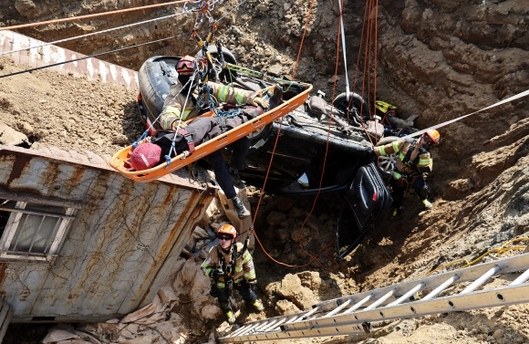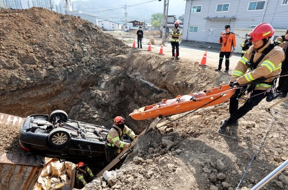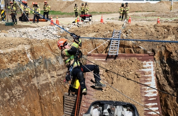 15일 경기도 하남시 천현동 교산 공공주택지구 공사현장에서 열린 ‘2026년 중대재난대응 유관기관 합동훈련’에서 소방관들이 싱크홀 발생으로 인한 매몰 상황을 가정해 구조훈련을 하고 있다.