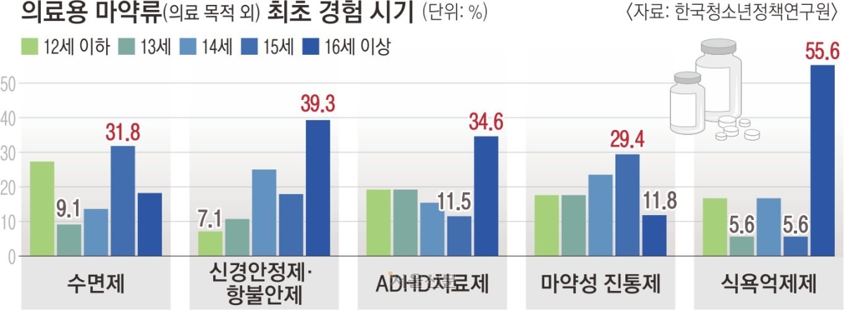 오남용이 가장 두드러진 약물은 ADHD 치료제였다. 비의료 목적으로 최근 6개월 내 의료용 마약류를 사용한 청소년 4명 중 1명(24.4%)이 이 약물을 꼽았고 식욕억제제(20.0%)와 수면제(13.3%)가 뒤를 이었다. 특히 ADHD 치료제 복용자 23.1%는 한 달에 20회 이상 약을 찾았다. 약물에 손을 댄 주된 이유는 ‘성적’(24.4%)이었다. 보고서를 작성한 배상률 선임연구위원은 “단순 호기심을 넘어 학업 효율을 높이기 위한 약물 사용이 일부 청소년 사이에서 현실화했다”고 진단했다.