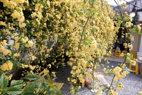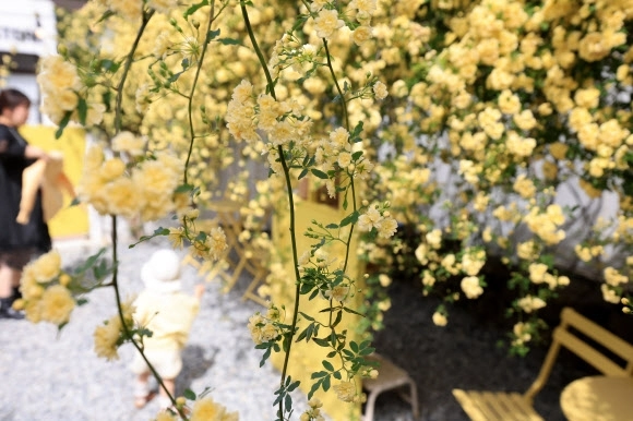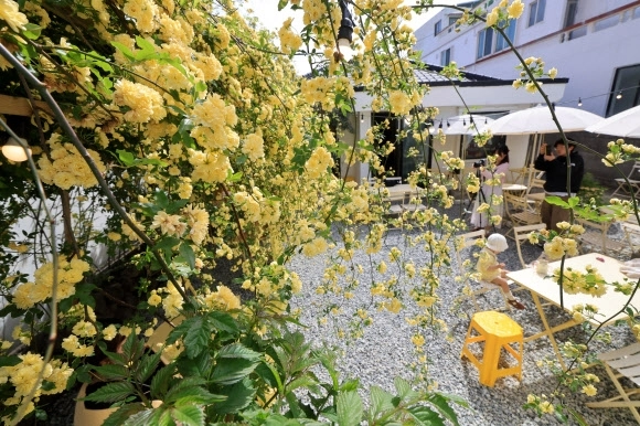 21일 오전 제주시 이도일동의 한 카페 마당에 목향장미가 활짝 피어 방문객들을 설레게 하고 있다.