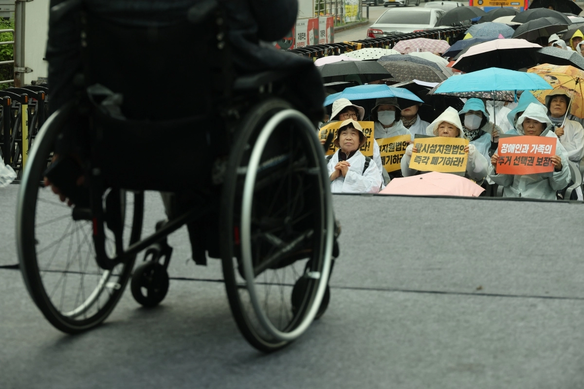 장애인의 날인 지난 20일 국회 앞에서 열린 2026년 시설 거주 장애인 권리 선포 집회에서 한국장애인복지시설협회 관계자들이 장애인 ‘탈시설’ 추진을 반대하고 있다. 연합뉴스