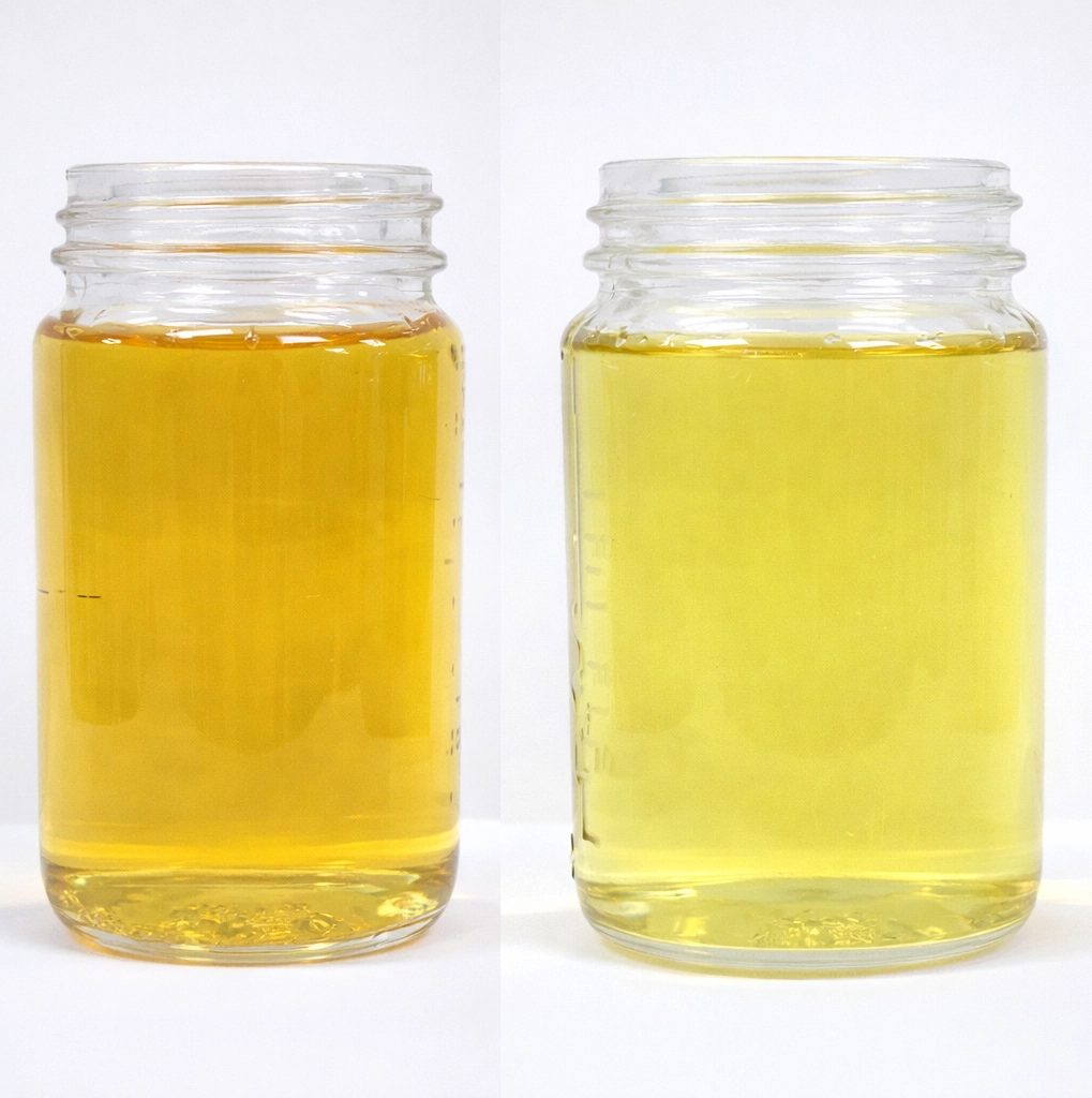 생산기술연구원 연구팀이 폐플라스틱을 열분해해 생산한 열분해유(왼쪽). 열분해유와 합성유를 섞은 블렌딩유(오른쪽). 블렌딩유는 현재 쓰이는 산업용 기어 윤활유 기준을 충족해 조만간 상용화 연구에 돌입할 에정이다.