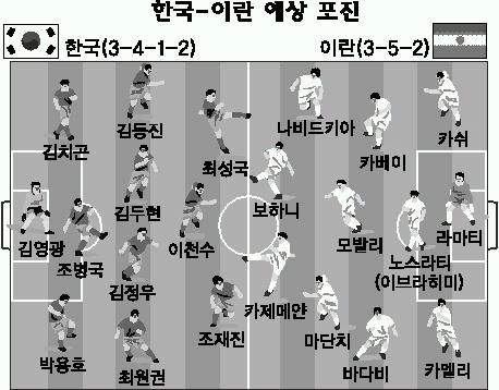 이란의 공격력은 가공할 만하다.특히 수비라인은 모두 180㎝가 넘는 장신으로 제공권 싸움에선 애를 먹을 것이다.그러나 이것이 약점이 될 수 있다.제공권은 뛰어나지만 반대로 순발력이 떨어진다.짧고 빠른 패스와 측면 돌파가 필요하다.이어 낮고 빠른 센터링으로 득점을 노려야 한다.수비에선 플레이메이커 모발리를 적극 봉쇄해야 한다.말레이시아전에서도 2골을 뽑는 등 골결정력도 탁월하다.