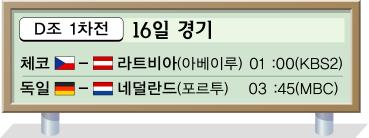 먼저 포문을 여는 것은 ‘우승후보’ 체코(11위)와 ‘돌풍’ 라트비아(53위).16일 새벽 1시 아베이루 스타디움에서 맞붙는다.체코는 A매치 21경기 무패 행진중이고,라트비아는 2002월드컵 3위 터키를 탈락시키고 첫 출전했다.