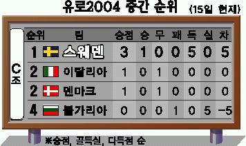 스웨덴은 같은 조 이탈리아-덴마크의 경기가 0-0 무승부로 끝남에 따라 조 1위로 올라서며 8강 진출의 유리한 고지를 점했다.특히 여름평균 기온이 섭씨 15도에 불과한 스웨덴 덴마크 등 북유럽 국가들이 섭씨 30도를 웃도는 경기장에서 선전을 펼친 것은 의외로 받아들여지고 있다.