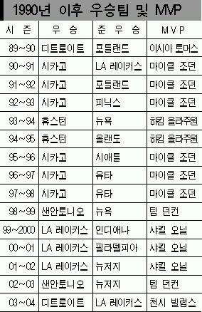 디트로이트는 농구가 개인기 의존도가 높기는 하지만 역시 단체종목임을 새삼 확인시켰다.별명에 걸맞게 거칠고 짜임새 있는 수비를 앞세워 챔프전 내내 ‘호화군단’의 개인기를 철저히 봉쇄했다.악착같은 리바운드에 이은 속공,철저한 협력수비가 승리의 원동력이 된 것이다.