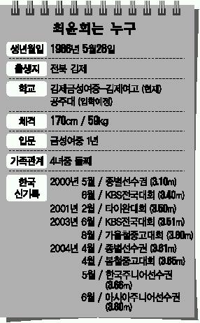 김제여고 3학년 최윤희는 4년전 첫 한국기록(3.10m)을 세운 이후 ‘브레이크 없는 기차’처럼 신기록 행진중이다.지난 15일 말레이시아 아시아주니어육상선수권에서는 3.80m에 걸린 바를 훌쩍 넘으며 동메달을 따냈다.9번째 한국신기록이다.