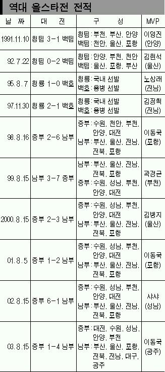 올림픽대표의 ‘패기’와 2002한·일월드컵 전사의 ‘관록’이 맞붙는다.월드컵 4강 신화의 주역 김남일(전남) 이운재(수원) 최진철(전북) 김태영(전남)은 올스타 팬 투표에서 1∼4위를 휩쓸며 식지 않는 인기를 과시했다.올림픽 4강 신화를 꿈꾸는 ‘젊은피’들이 선배들과의 한판 승부를 준비중이다.미드필드에서는 ‘철인’ 김동진(서울),‘맏형’ 최태욱(인천)이 ‘진공청소기’ 김남일과 맞대결한다.‘포스트 홍명보’ 조병국(수원)과 김치곤(서울)은 최진철 김태영과 ‘그물수비’ 대결을 펼친다.또 이운재와 ‘리틀 칸’ 김영광(전남)의 ‘거미손’ 대결도 관심거리다.