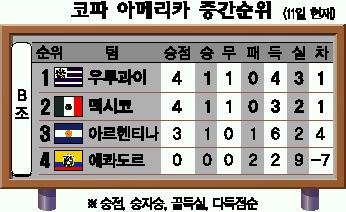 멕시코 돌풍에 일격을 당한 아르헨티나는 이날 에콰도르를 2-1로 꺾은 우루과이와 멕시코에 조 선두를 내주고 3위로 주저앉았다.
