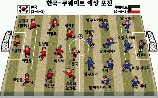 한국은 요르단과의 첫 경기에서 득점 없이 비긴 뒤 아랍에미리트연합(UAE)을 2-0으로 꺾으며 한숨을 돌렸다.쿠웨이트와 비기기만 해도 조 2위로 8강에 오를 수 있지만 비긴다는 각오는 금물.쿠웨이트에 일격을 당하면 1승1무1패로 쿠웨이트(2승1패)에 처지게 돼 같은 시간 베이징에서 열리는 요르단-UAE전 결과에 따라 조 2위를 가리는 경우의 수를 따져봐야 하는 데다 요르단이 승리할 가능성이 높아 탈락이 확실하다.