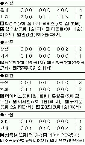 무난히 승리하는 듯싶었던 LG는 7회 초 바뀐 투수들이 난타당하며 대거 4실점,승부를 안개 속으로 몰고 갔다.그러나 공수교대 뒤 김재현의 2타점 적시타로 승부를 결정지었다.