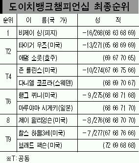 이로써 싱은 세계랭킹 포인트 48점을 보태며 평균 평점 12.72점을 기록,이 대회 공동2위에 그쳐 12.27점에 머문 우즈를 제치고 1인자가 됐다.