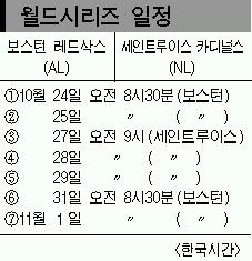 이번 월드시리즈(7전4선승제)는 팀 통산 10번째 우승에 도전하는 세인트루이스와 ‘밤비노의 저주’를 떨치고 86년 만에 정상을 노리는 보스턴 레드삭스의 한판 승부로 펼쳐진다.1차전은 24일 보스턴에서 열린다.