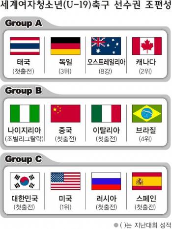 우선 12개 팀이 3개조로 나뉘어 조별리그를 펼친다.8강 토너먼트(각조 1·2위와 와일드카드 2개 팀)에 오르기 위한 길은 험난하다. 디펜딩챔피언 미국과 유럽챔피언 스페인, 동구 강호 러시아 등과 함께 ‘죽음의 C조’에 속했기 때문. 국제축구연맹(FIFA) 성인여자대표팀 랭킹만 살펴봐도 한국은 26위인 반면 미국 러시아 스페인은 각각 2,11,21위를 달리고 있다.