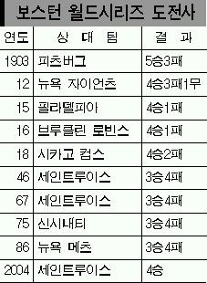 보스턴 레드삭스와 세인트루이스 카디널스의 월드시리즈 4차전이 열린 28일 미국 세인트루이스 부시스타디움.9회말 보스턴 마무리 키스 폴크가 마지막 타자를 침착하게 땅볼 아웃으로 처리했다. 순간 마운드로 몰려 나온 보스턴 선수들은 86년 만의 감격에 한데 뭉쳤다. 커트 실링도 함께 팀을 정상으로 이끈 데이비드 오티스와 매니 라미레스, 페드로 마르티네스 등 ‘도미니카 트리오’를 양 팔로 안은 채 한동안 말문을 잇지 못했다.‘빨간 양말’들이 ‘저주’를 넘어 새로운 ‘기적의 역사’를 쓴 순간이었다.