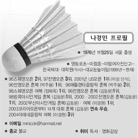 최근 한국체대 배드민턴체육관에서 ‘셔틀 퀸’ 나경민(28·대교눈높이)을 만났다. 모처럼 환히 웃는 모습이 낯설기조차 했다. 지난 8월 아테네올림픽 혼합복식 8강 탈락의 충격이 채 가시지 않아 아직도 풀죽어 지낼 것이라는 당초 예상은 완전히 빗나갔다.