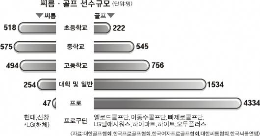스포츠마케팅 전문가들은 ‘팽창’하는 골프와 ‘고사’하는 씨름의 차이점을 ‘저변’과 ‘돈’에서 찾는다.
