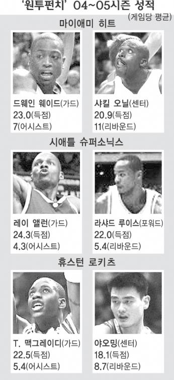 하지만 03∼04시즌이 끝난 뒤 오닐은 마이애미 히트로 보금자리를 옮겨 ‘차세대 공격형 가드’ 드웨인 웨이드(22·193㎝)와 새로운 콤비를 결성했다. 골밑 철옹성을 구축한 오닐에게 상대 수비 2∼3명이 달려드는 순간 3점슈터에게 공을 배달하거나, 골밑으로 쇄도하는 동료에게 노룩패스를 하는 등 특급가드 못지않은 어시스트 능력을 뽐내고 있다. 지난 시즌 르브론 제임스(20·203㎝·클리블랜드 캐벌리어스)와 신인왕을 다퉜던 ‘투지의 화신’ 웨이드는 과감한 골밑 돌파로 마이애미의 최근 8연승을 주도했다. 경기당 43.9점 16리바운드를 합작한 ‘샤크-웨이드 콤비’의 궁합은 성적으로 직결됐다. 지난 시즌 42승 40패로 5할 승률에 턱걸이했던 마이애미는 21일 현재 19승7패로 동부콘퍼런스 선두를 질주하고 있다.
