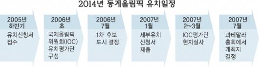 한편 동계올림픽 유치 경쟁은 2005년 하반기쯤 IOC에 유치신청서를 제출하면서 본격적으로 시작될 전망이다.IOC는 2006년 초 유치평가단을 구성해 2006년 7월 1차 후보도시를 결정한다.1차 후보도시로 선정되면 2007년 1월쯤 명확한 개최 계획을 담은 유치신청서를 제출해야 하며 2∼3월 IOC 평가단의 현지 실사를 받아야 한다.