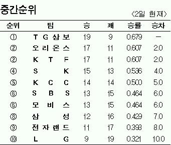 1·2위간 접전이 벌어진 부산에서는 TG가 김주성(12점)-자밀 왓킨스(18점) ‘더블포스트’의 위용을 한껏 자랑하며 KTF를 74-66으로 꺾었다.19승9패가 된 TG는 이로써 공동 2위 KTF와 오리온스를 2게임 차로 따돌렸다.