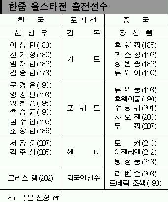 하지만 중국 올스타팀도 ‘국가대표팀급’ 전력을 갖춰 어려운 경기가 될 전망이다. 기둥센터 야오밍(휴스턴 로키츠)이 빠졌을 뿐,10명의 전·현 국가대표 선수들이 포진하고 있다. 특히 이들 가운데 류웨이 등 4명은 미국프로농구 진출을 타진할 만큼 뛰어난 기량을 지녔다.