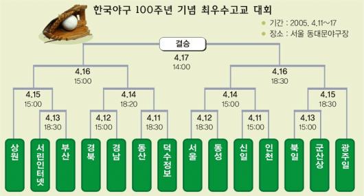 그들이 100년의 옷으로 갈아입고 함성속으로 돌아온다. 무대는 11일 개막하는 한국야구 100주년 기념 최우수고교대회. 전국대회 20회 우승으로 최다를 기록한 경북고를 비롯, 경남고(14회) 부산고(12회) 신일고 광주일고(이상 11회) 등 역대 성적순으로 뽑힌 14개 명문팀이 초청돼 일주일 동안 역사와 전통을 겨룬다.