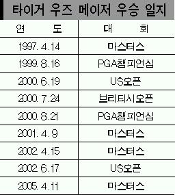 하지만 우즈는 연장 첫 홀(18번홀)에서 버디를 뽑아내며 극적으로 정상에 올라 비제이 싱(피지)에게 빼앗겼던 세계 랭킹 1위 자리를 22일 만에 되찾는 ‘두 배의 기쁨’을 누렸다.1997년과 2001년,2002년에 이어 네번째 우승컵을 품은 우즈는 이로써 아널드 파머(미국)와 마스터스 최다 우승 공동 2위로 어깨를 나란히 했다. 지난해 부진에서 탈출, 기량을 완전히 회복한 우즈는 향후 4∼5년 내에 마스터스 은퇴를 선언한 잭 니클로스(미국)가 보유한 최다승 기록(6회)을 넘어설 것으로 판단된다.