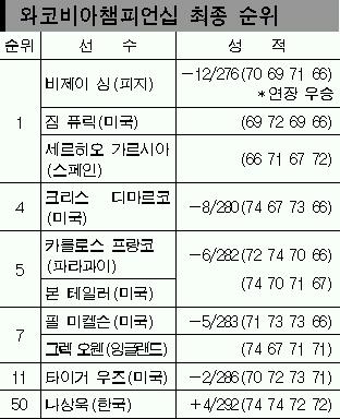 싱은 9일 미국 노스캐롤라이나주 샬럿의 퀘일할로골프장(파72·7442야드)에서 벌어진 미국프로골프(PGA) 투어 와코비아챔피언십(총상금 600만달러) 4라운드에서 6언더파 66타를 몰아치며 합계 12언더파 276타로 세르히오 가르시아(스페인), 짐 퓨릭(미국)과 연장에 뛰어든 뒤 시즌 세번째 우승컵을 안았다. 함께 ‘빅3’로 불리는 타이거 우즈, 필 미켈슨(이상 미국)과 시즌 다승 공동선두로 나선 싱은 지난달 12일 3주 만에 우즈에게 내준 세계 랭킹 1위 탈환에도 청신호를 켰다. 올시즌 두차례 포함, 통산 연장 승부는 7승2패.