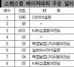 그 목표의 절반이 9일 밤(한국시간) 미국 메릴랜드주 하브드그레이스의 불록골프장(파72·6486야드)에서 개막하는 시즌 두 번째 메이저대회인 미여자프로골프 맥도널드LPGA챔피언십(총상금 180만달러)에서 일궈질 가능성이 높다. 지난 3월 나비스코챔피언십에서 압도적인 타수차로 시즌 첫 메이저승을 신고한 소렌스탐은 이 대회마저 휩쓸 경우 가뿐히 대기록의 5부 능선을 넘게 되는 셈이다.