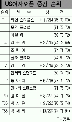 젊은 ‘코리아 여전사’들도 빛났다. 김주연(24·KTF)은 보기 1개와 버디 3개를 묶어 데일리베스트인 2언더파 69타를 쳐 1타를 줄인 새내기 조령아(21)와 중간합계 2오버파 215타로 선두그룹에 1타차 공동 4위에 올랐다.1언더파를 친 김영(25·신세계)도 공동 7위에 올라 역전 우승을 사정권에 뒀다. 그러나 김미현(28·KTF)은 무려 5타를 까먹어 공동 30위로 처졌고, 박세리는 10오버파로 공동 56위로 떨어졌다.