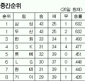 두산은 수원에서 용병 맷 랜들의 호투와 2점포와 3루타 등 3타점을 몰아친 손시헌의 ‘만점’ 타격에 힘입어 현대를 4-0으로 완파했다. 두산은 이로써 이날 SK에 발목을 잡힌 삼성과 지난달 18일 이후 39일만에 공동 1위를 이뤘다.